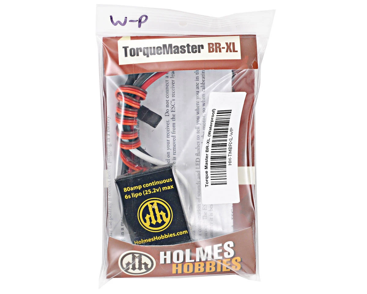 This is the Holmes Hobbies Waterproof TorqueMaster BR-XL Brushed ESC. Designed and manufactured in the U.S.A., the TorqueMaster BR-XL is the hottest brushed motor ESC for rock crawling applications. With a 80 amp continuous rating and a huge input voltage rating of 28.8V, this ESC has been designed from the ground up to meet the rigorous demands of low speed control and high speed power giving even the most power hungry drivers what they want. A 5 amp, 6 volt on board switchmode BEC delivers unbelievable servo power at any input voltage.