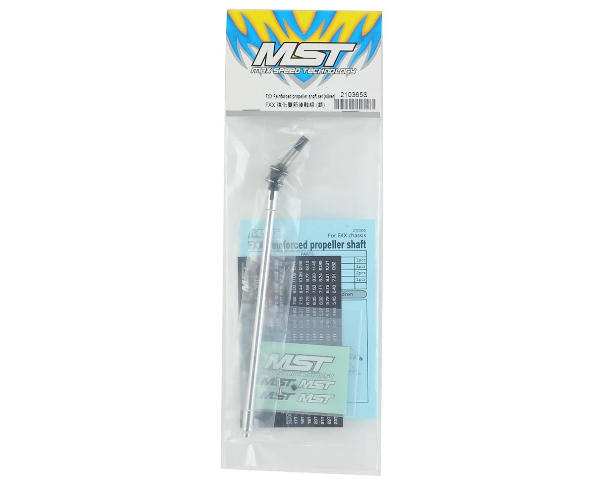 The MST FXX-D Reinforced Propeller Shaft Set is an upgrade that replaces the stock driveshaft with a more durable, higher quality option. The design features a replaceable coupler ball on the bevel gear end for increased strength and longer life, and a DCJ style coupler to help reduce vibration and increase efficiency. Plus, it is available in a variety of colors so you can create a custom, one of a kind ride. Package includes one aluminum center driveshaft with factory assembled couplers and output shaft, one pin and one setscrew.