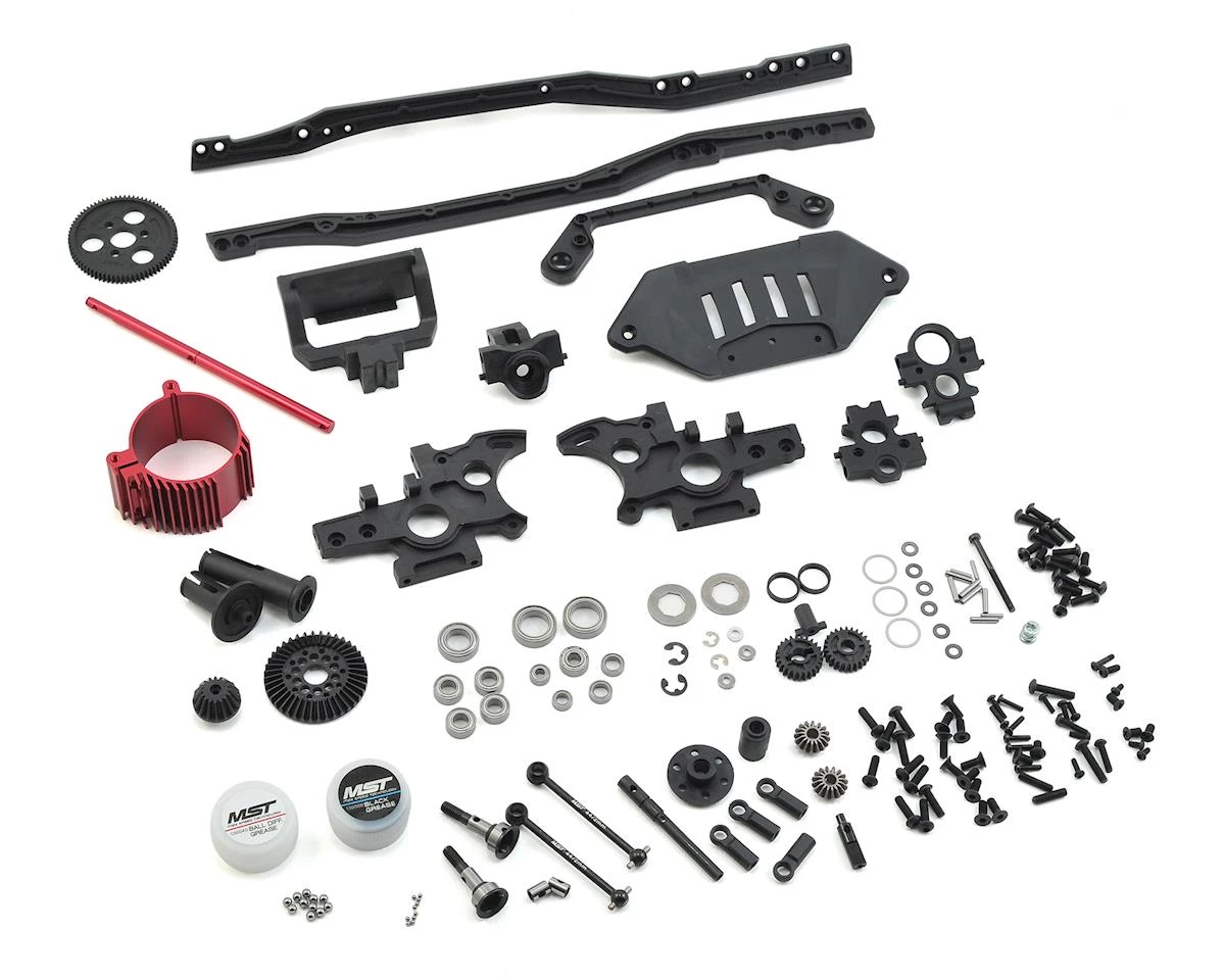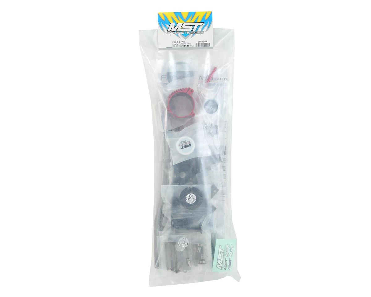 The MST FXX-D S 4WD Lateral Motor Kit is a motor position conversion kit that moves the motor from beneath the front shock tower to in front of the shock tower, with 4WD drivetrain. The lateral front motor configuration allows you to swap the position of the spur gear to the right or left side of the chassis, and change the handling of the car to suit your preference. MST recommends the motor direction forward is used for small and twisty tracks, and the motor direction backward for large and fast tracks.