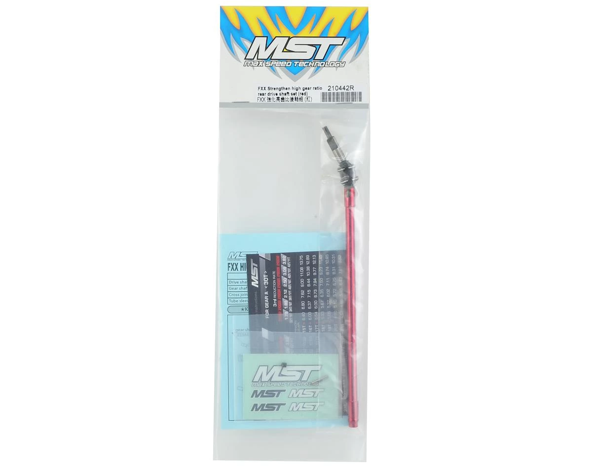 The MST FXX-D Strengthen High Gear Ratio Drive Shaft is an upgrade for the FMX-D, FSX-D and FXX-D models. The design features a replaceable coupler ball on the bevel gear end for increased strength and longer life and a DCJ style coupler to help reduce vibration and increase efficiency. Plus, it is available in a variety of colors so you can create a custom, one of a kind ride. Package includes one aluminum center driveshaft with factory assembled couplers and output shaft, one pin and one setscrew.