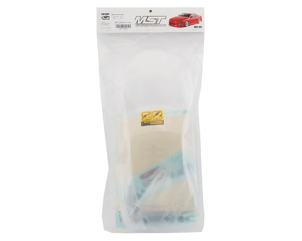 MST JZ3 Drift Body. This clear body includes clear lexan light buckets, as well as molded plastic detail pieces, window masks and decals.
