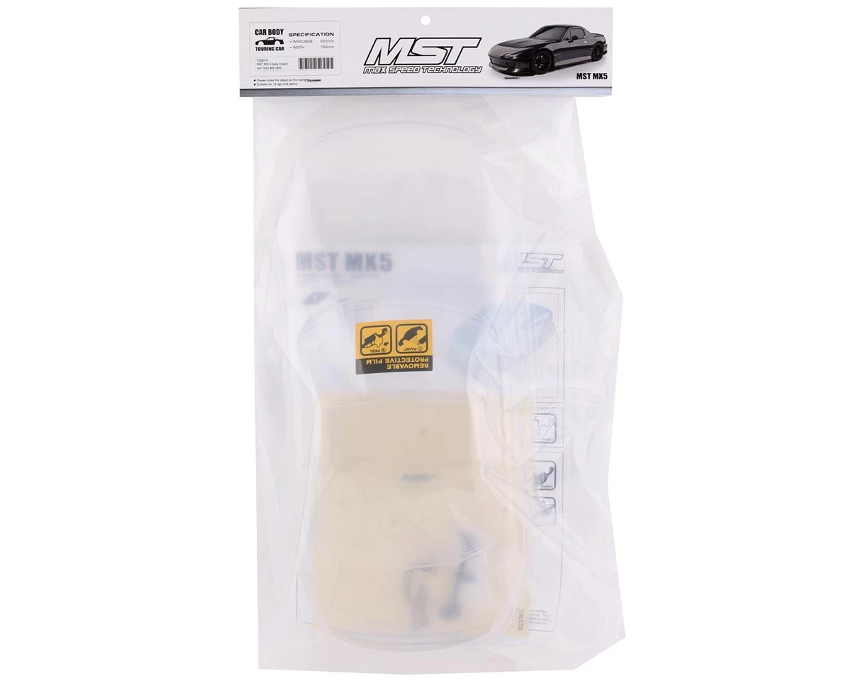 The MST MX5 Touring Body offers custom tuner styling and is ready for your custom paint. Molded plastic rear view mirrors and detailed decals offer a high level of realism, and will look great on your build. Package includes one body, two plastic side mirrors, one window mask sheet and one decal sheet.