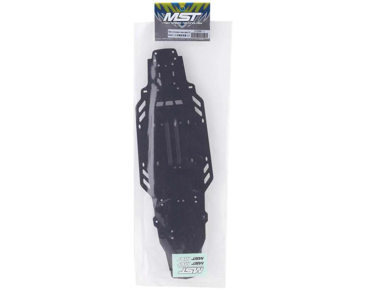 MST RMX 2.0 3mm Carbon Lower Deck. This is the optional carbon chassis for the MST RMX 2.0 kit and is a direct installation upgrade for the stock chassis (MXS-230072). The carbon plate will help to stiffen up the chassis and provide more precise handling performance. Package includes one chassis and two adhesive foam strips.